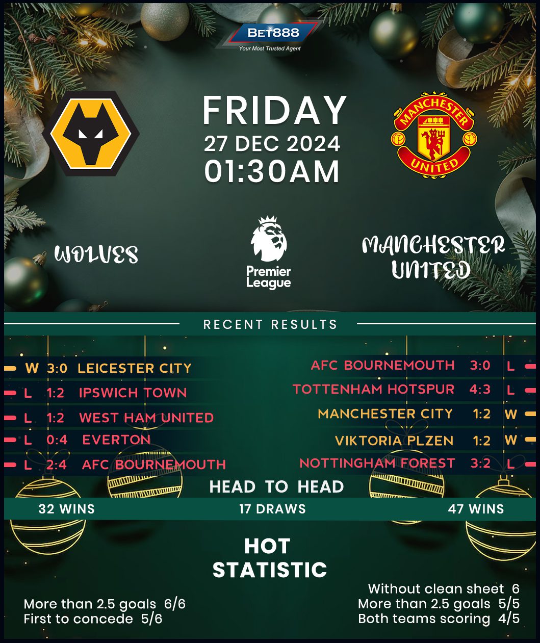 Immediately after sacking manager Gary O’Neil, Wolverhampton Wanderers returned to winning ways in the Premier League under new boss Vítor Pereira, dismantling fellow Midlands rivals Leicester City 3-0 last weekend to end a dreadful four-game losing run. However, Pereira still has a lot on his plate, with Wolves entering Boxing Day in the bottom three, albeit only two points adrift of safety. His next task is to rebuild Wolves’ home fortress, with Molineux breached six times in eight Premier League contests this season (W1, D1, L6), including the last two. Man Utd’s upcoming visit spells further trouble, with the Wanderers losing four consecutive home league H2Hs since 2021 via a single-goal margin, including a goal-glutted 4-3 defeat in this corresponding fixture last season.
