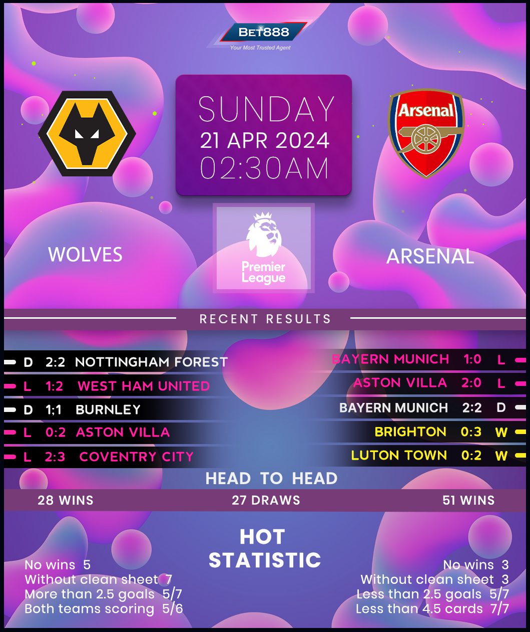 That win extended Arsenal’s winning H2H streak to five matches, and they need to make it six if they’re to stay alive in the Premier League title race. However, the Gunners’ morale has taken two massive blows in the past seven days. After a 2-0 home defeat to Aston Villa knocked them down from a near-perfect league record in 2024 (W10, D1), Bayern Munich crashed them out of the Champions League quarter-finals in midweek. A gut-wrenching 1-0 loss at the Allianz Stadium marked Arsenal’s third scoring blank on their last five competitive travels, suggesting another win at Molineux isn’t a foregone conclusion. But this venue has been a happy hunting ground fo Mikel Arteta’s side as they’ve won three of their four away H2Hs ‘to nil’ since 2020 (L1).