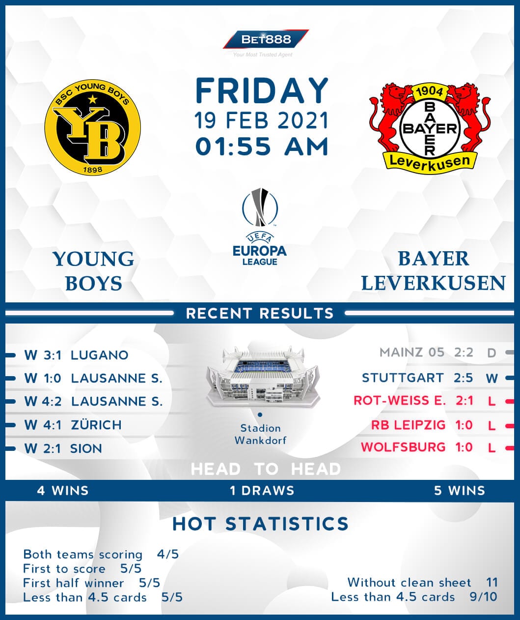 Stadion Wankdorf is the venue, as Young Boys and Bayer Leverkusen meet in the first leg of their UEFA Europa League last-32 tie. It will be the first European showdown between these two sides.