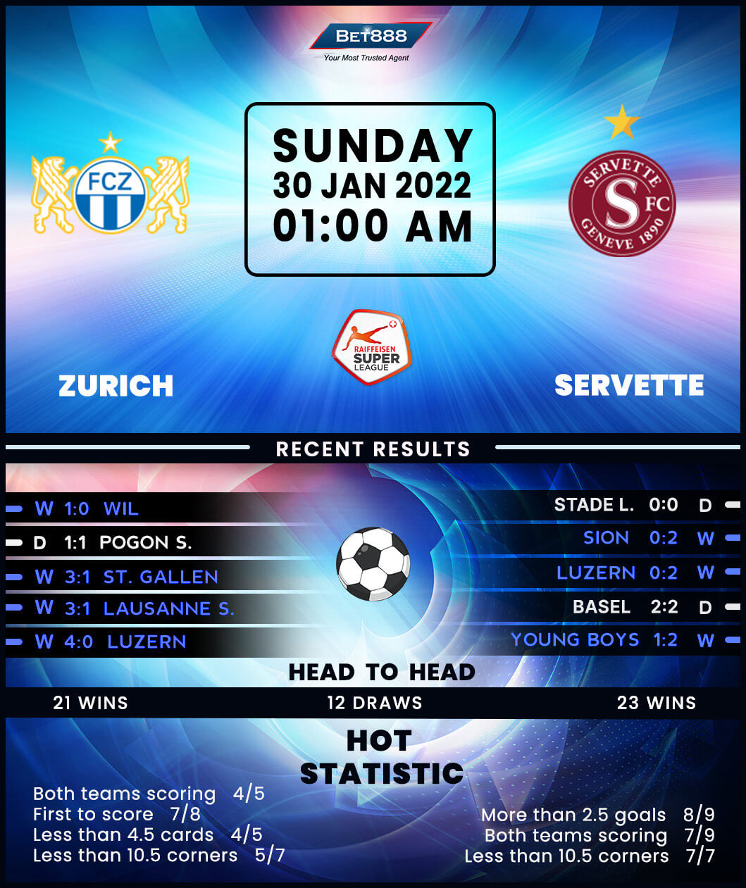 In the meantime, Servette enjoyed a noticeable upturn in form down the final stretch of 2021, going from five consecutive Switzerland Super League defeats to putting together five league matches without losing (W4, D1). Interestingly, five (55.56%) of their nine games won/lost in that 11-fixture sequence yielded an identical 2-1 scoreline, highlighting the potential for a high-scoring contest. Servette’s confidence about staging an upset here could be high. They are unbeaten in their last three league visits to Zurich (W1, D2) and are currently enjoying a three-game winning streak away from home in the Switzerland Super League. But conceding first could hinder those hopes, with ‘Les Grenats’ losing eight out of nine top-flight fixtures when falling behind this term (W1).